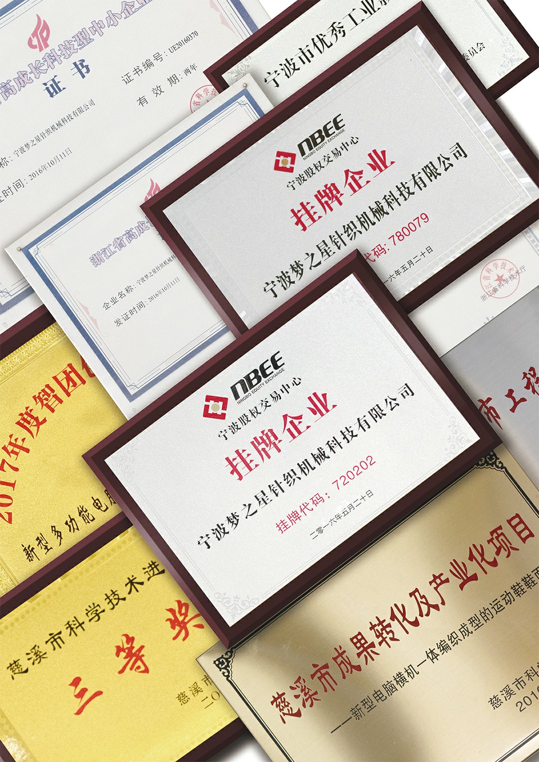 2016年11月被评为慈溪市高新技术成果转化及产业项目企业-新型电脑横机一体编制成型的运动鞋鞋面机;